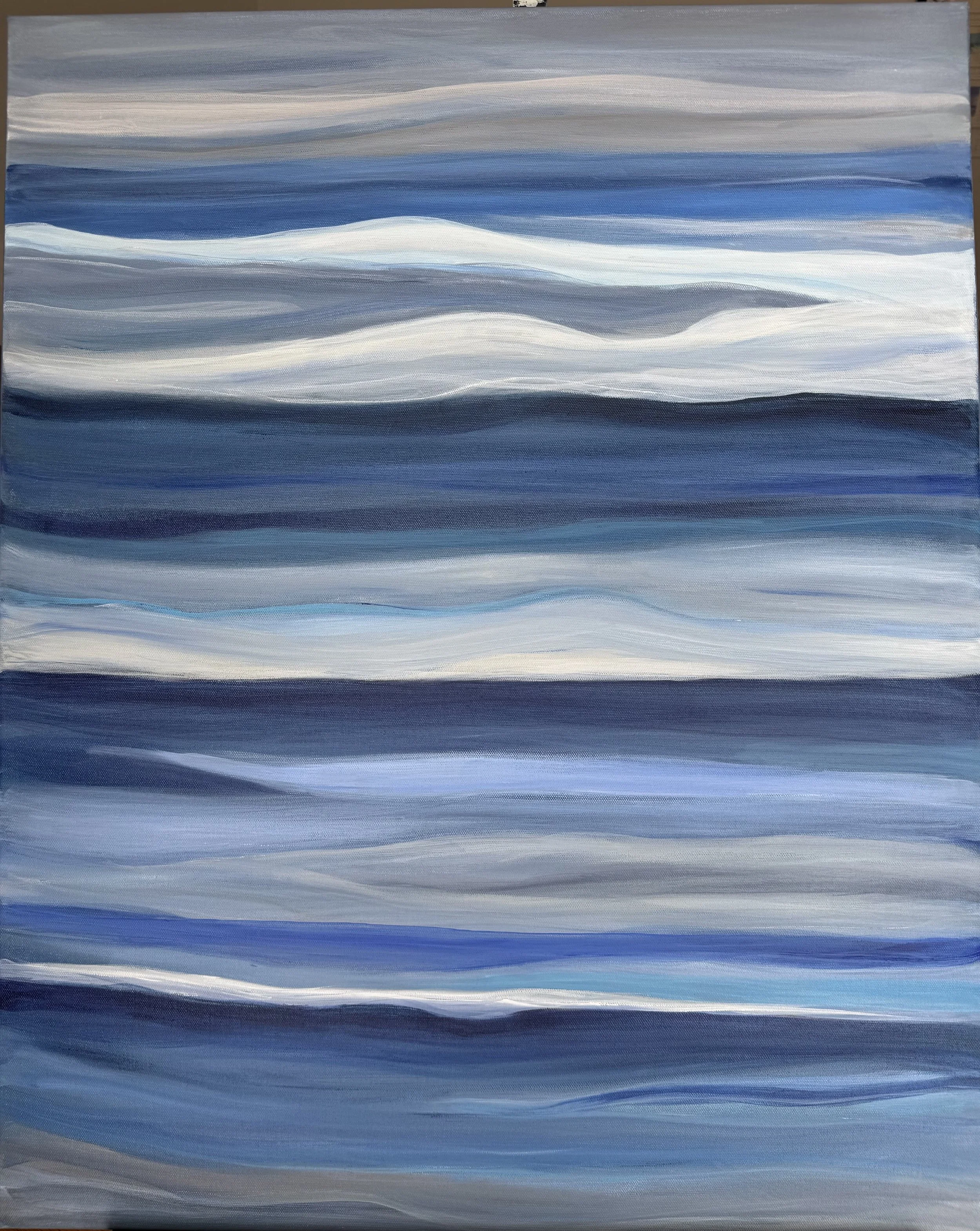 Adrift in the Mist II is a meditative exploration of movement, light, and atmosphere. Soft, horizontal bands of layered blues, grays, and whites drift across the canvas in fluid, wave-like gestures, evoking the quiet rhythm of water and mist. The subtle transitions between tones suggest a horizon obscured by fog, inviting the viewer into a space of calm reflection and open interpretation. This abstract seascape captures the sensation of floating between sea and sky, where boundaries dissolve into pure feeling.