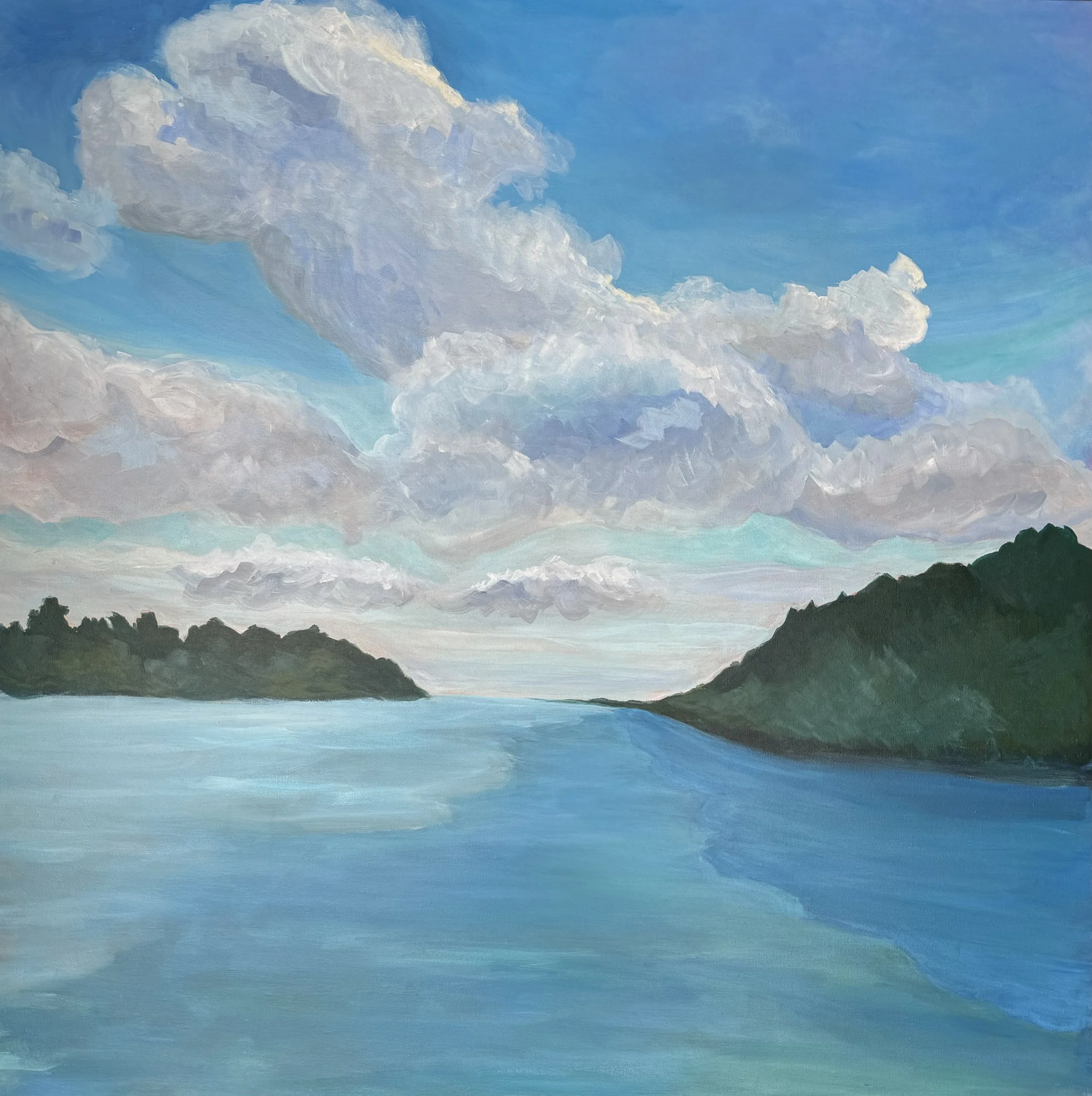 Golden Hour captures the tranquil beauty of nature at day’s end, when light and sky meet in a quiet, luminous embrace. Broad, sweeping clouds drift across a vivid blue sky, reflecting soft pastel tones that dance over the calm water below. Framed by silhouetted landforms on either side, the scene leads the eye toward the glowing horizon, evoking a sense of peace, openness, and timeless stillness.