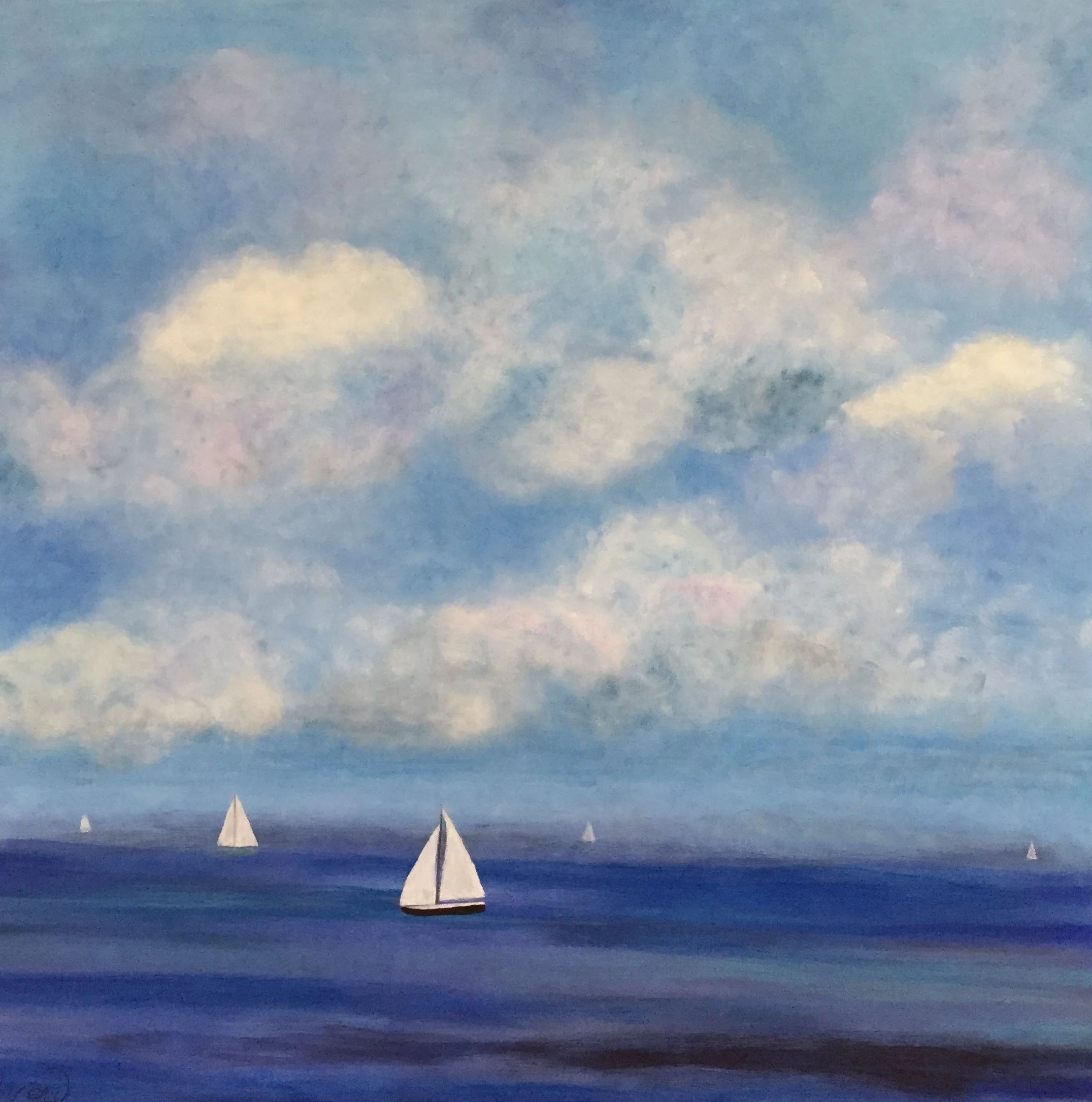 Regatta is a serene and atmospheric acrylic painting that captures the quiet elegance of sailboats drifting across a vast expanse of deep blue sea. Soft, impressionistic clouds sweep across the sky in gentle tones of blue, lavender, and ivory, creating a dreamlike backdrop for the crisp white sails scattered across the horizon. The composition invites a sense of calm, freedom, and open space — evoking the peaceful rhythm of a regatta at sea.